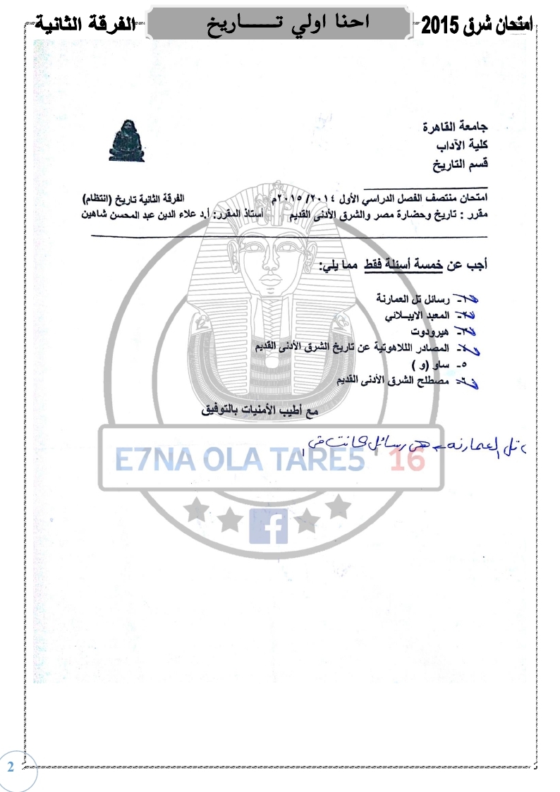 نماذج امتحانات شرق ادني العام السابق أحنا أولي تــــــاريخ