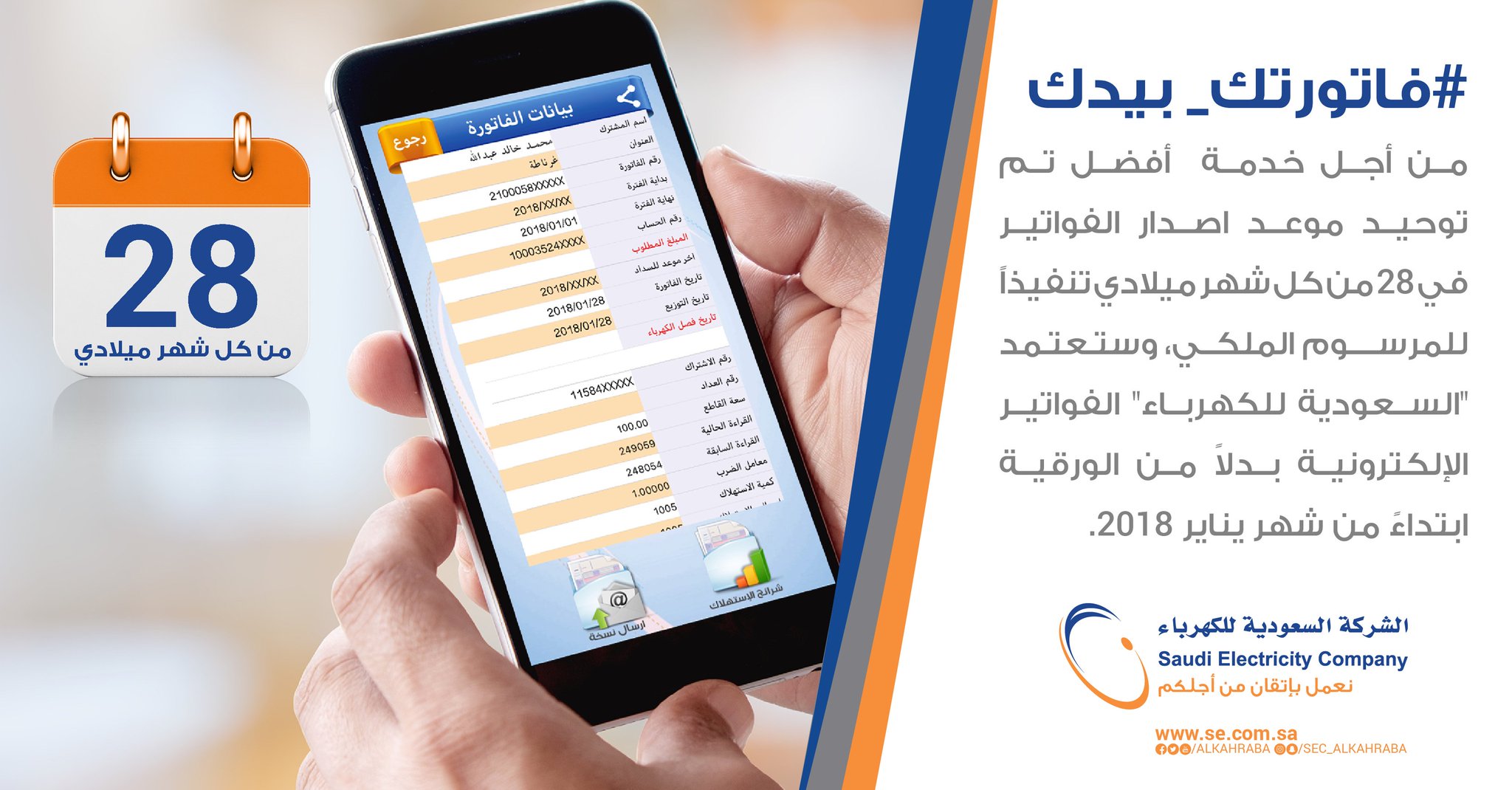 السعودية للكهرباء On Twitter من أجل خدمة أفضل تم توحيد موعد اصدار الفواتير في 28 من كل شهر ميلادي تنفيذا للمرسوم الملكي وستـعتـمد السعودية للكهرباء الفواتير الإلكترونية بدلا من الورقية ابتداء من شهر