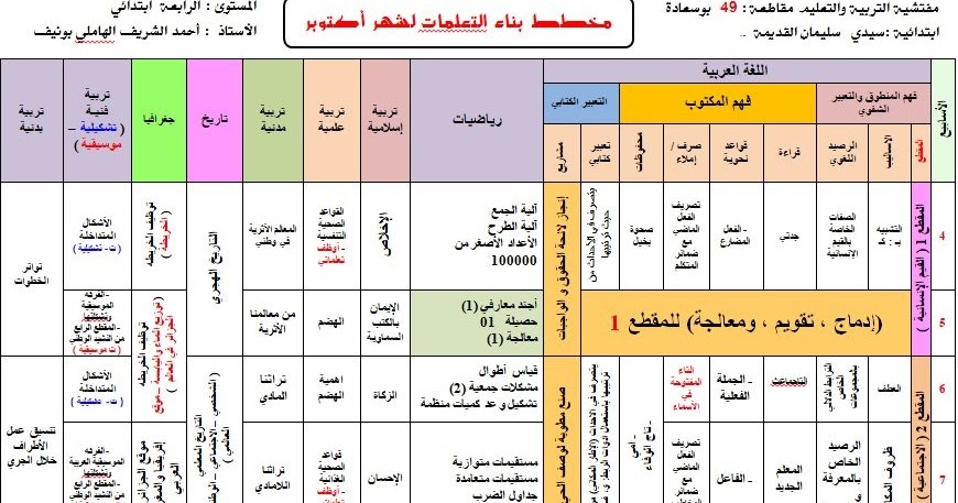 مخطط بناء التعلمات لشهر أكتوبر للسنة الرابعة ابتدائي حسب المناهج المعاد كتابتها 2019 2020