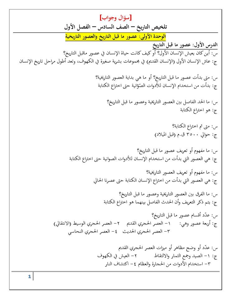 تلخيص الوحدة الأولى عصور ما قبل التاريخ والعصور التاريخية لمادة التاريخ للصف السادس الفصل الأول منتديات صقر الجنوب