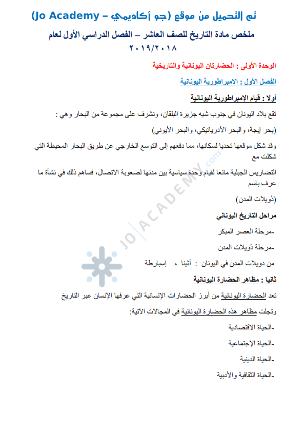 ملخص مادة التاريخ لطلبة الصف العاشر الفصل الدراسي الأول