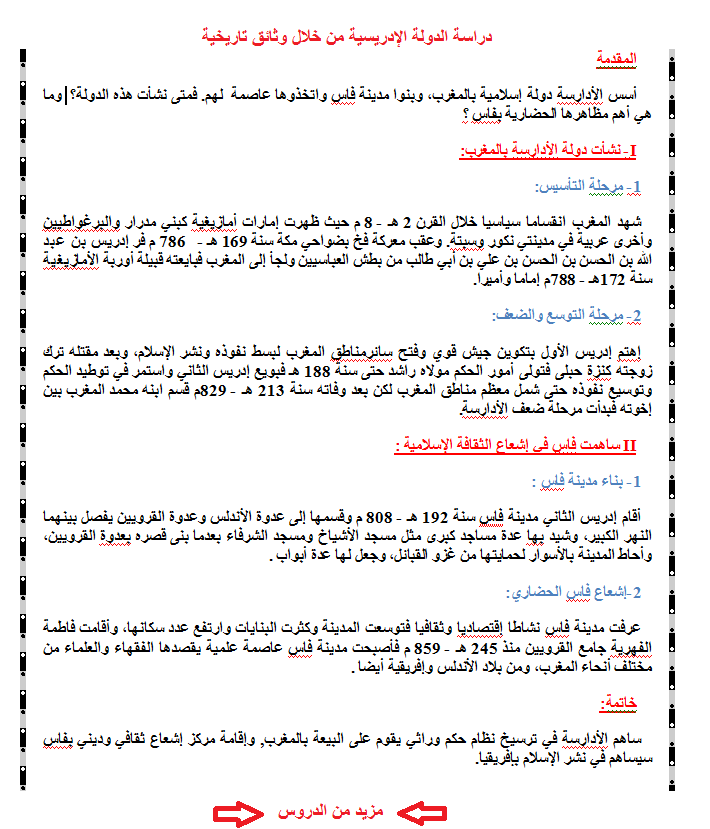 درس الدولة الإدريسية من خلال وثائق تاريخية للسنة الثانية إعدادي الصفحة 2 من 2 الدراسة