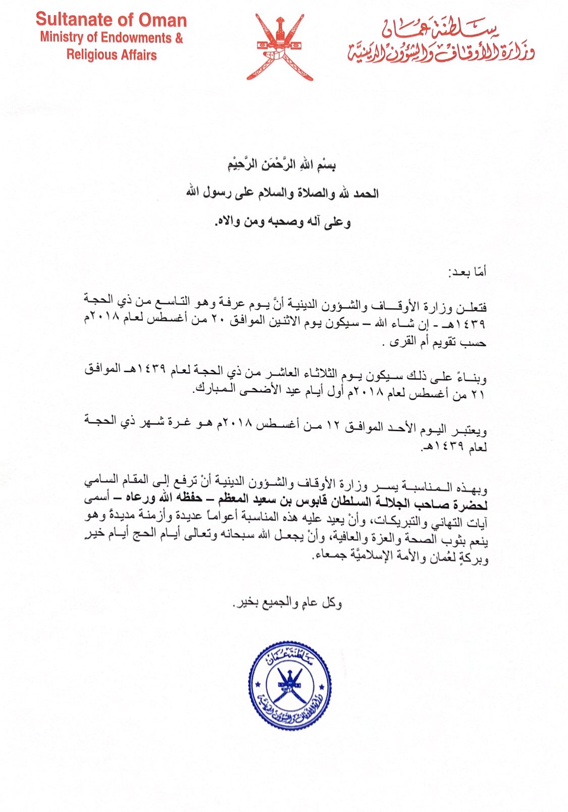وزارة الأوقاف والشؤون الدينية سلطنة عمان On Twitter بيان بشأن دخول شهر ذي الحجة لعام ١٤٣٩ هـ عمان