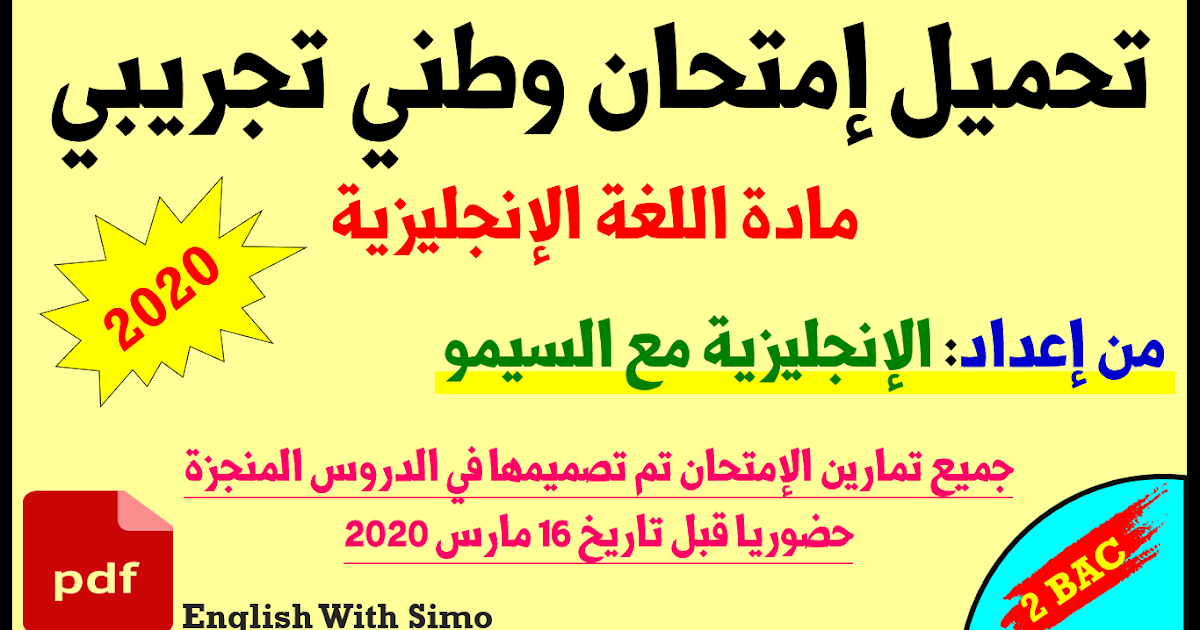 تحميل إمتحان وطني تجريبي مادة اللغة الإنجليزية دورة 2020 من إعداد الإنجليزية مع السيمو English With Simo
